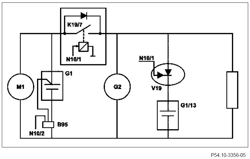 The control unit (ME) evaluates all relevant variables and grants the start enable. This is read in by the front SAM control unit via a direct line. The front SAM control unit then actuates the on-board electrical system disconnect relay (K19/7) and the ECO start/stop function diode (V19) at the front SAM control unit. The ECO start/stop function diode connects the ECO start/stop function additional battery to the on-board electrical system. Shortly afterward, the on-board onelectrical system disconnect relay isolates the on-board electrical system battery from the on-board electrical system for the duration the starting process. The energy requirement of the on-board electrical system is now solely covered by the additional battery for ECO start/stop function. This measure prevents the starting voltage dip which can be experienced by the vehicle occupants.