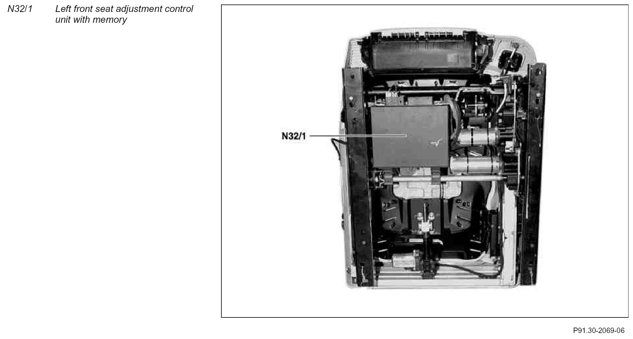 The left front seat adjustment control unit with memory (N32/1) is located under the left front seat.