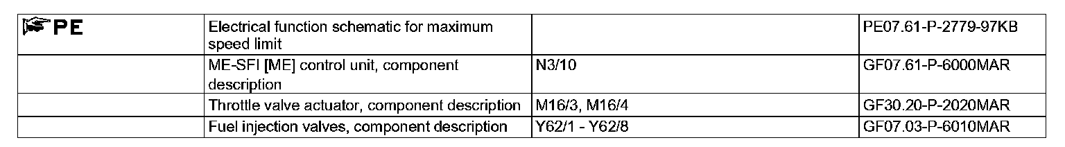 If 250 km/h is reached, the ME-SFI control unit reduces the throttle valve opening angles of the front and rear throttle valve actuators (M16/3, M16/4) and the injection time of the fuel injection valves (Y62).