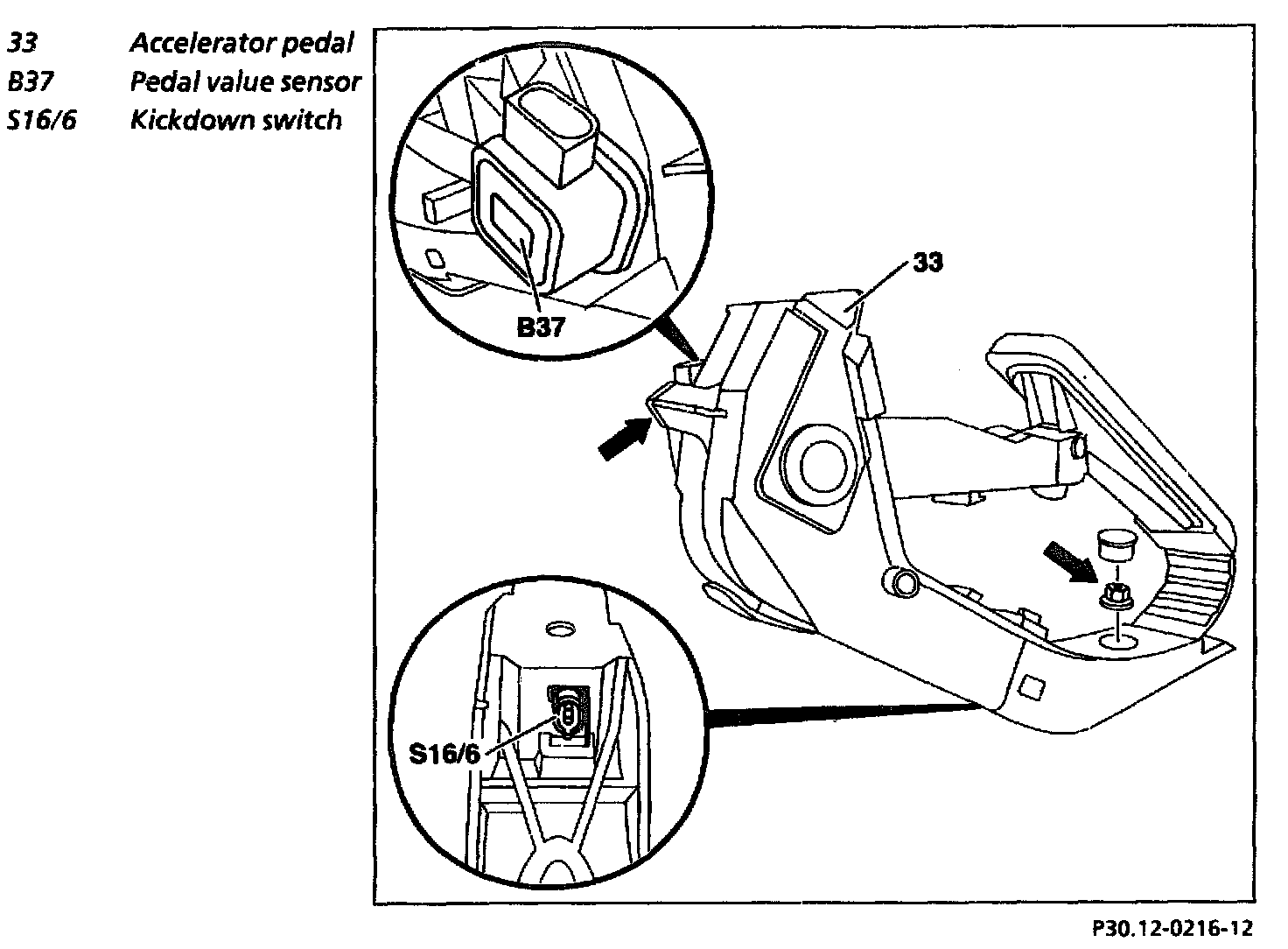 2 Unscrew nut (arrow) attaching accelerator pedal (33)