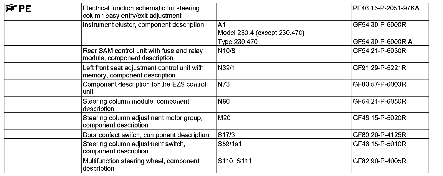 Terminal status circuit 15 is supplied on the interior CAN by the EIS control unit and status of the driver door, defined by the status of the left door contact switch (S17/3), by the rear SAM control unit (N10/8). The front seat adjustment control unit reads in all the relevant information, evaluates it and actuates the steering column up/down motor accordingly (M20m2).