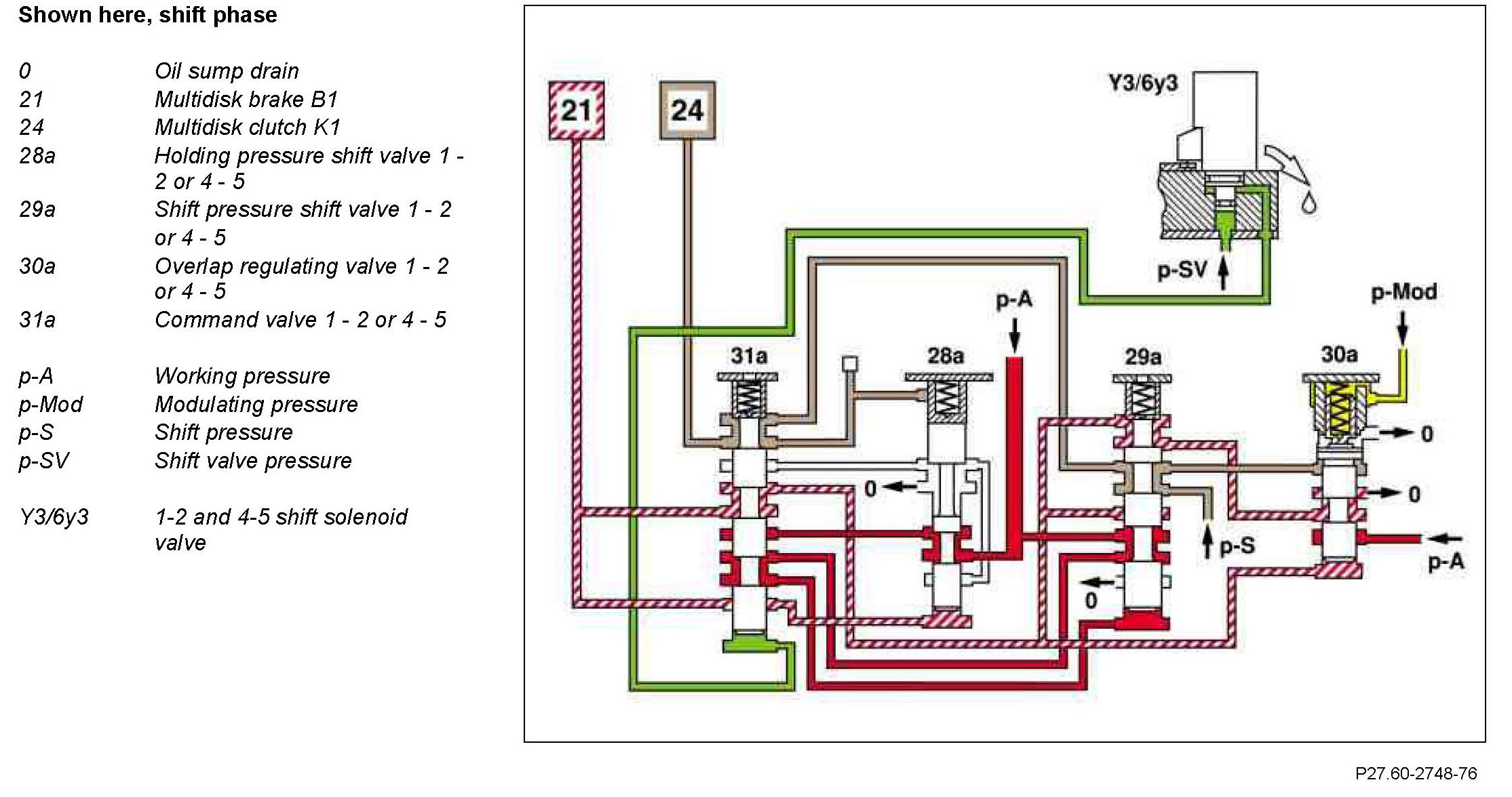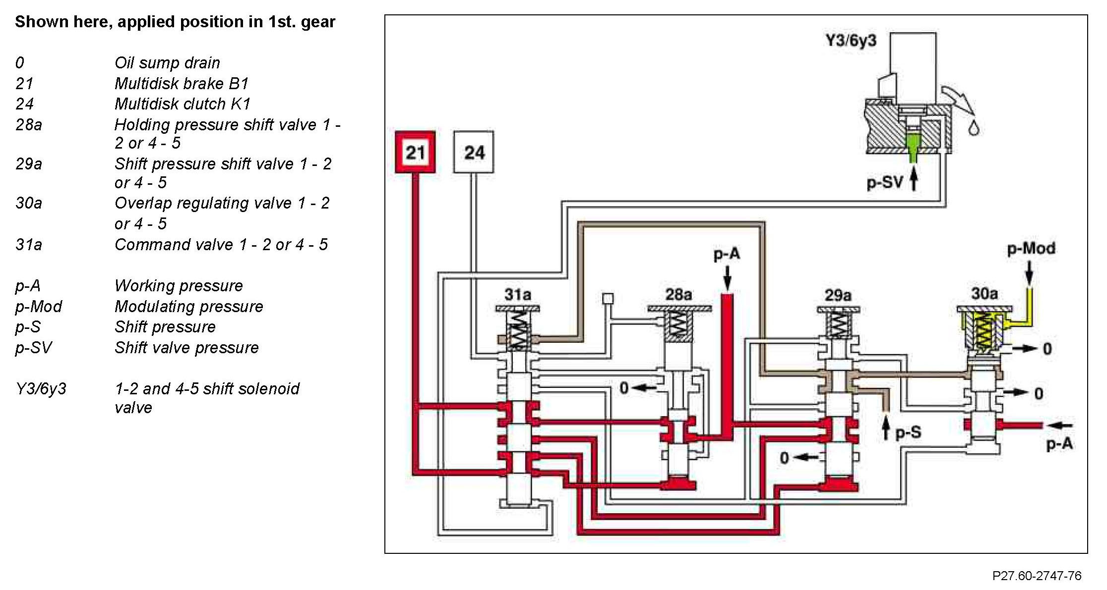 The multidisk brake B1 is switched off (unpressurized). The spring in the shift pressure shift valve 1 - 2 or 4 - 5 shifts this into the basic position.