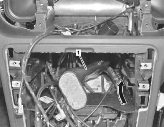 1 Guide air intake duct (1) through slot of COMAND controller unit into instrument panel in direction of arrow.