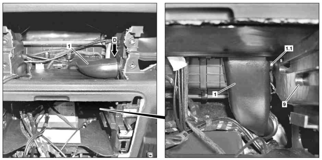 2 Position air intake duct (1), as shown, and clip guide (1.1) into slot (9) of COMAND controller unit.