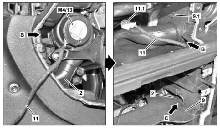 7 Route wiring harness (11) of COMAND fan motor (M4/13), as shown, through opening (arrow B) to bracket (9.1).