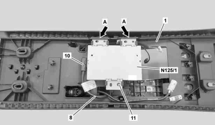 1 Insert media interface control unit (N125/1) into shackles (arrows A) on underside of center console (1).