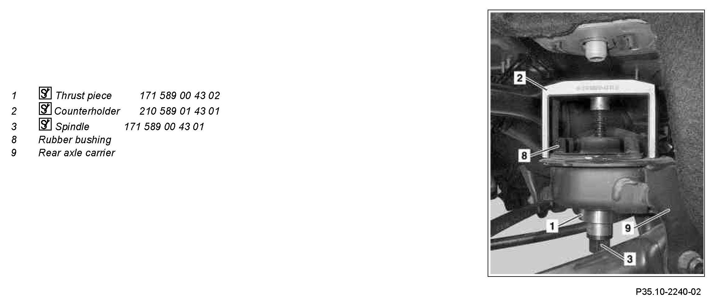 1 Using thrust piece (1), counterholder (2) and spindle (3), press rubber mount out of rear axle carrier (9).