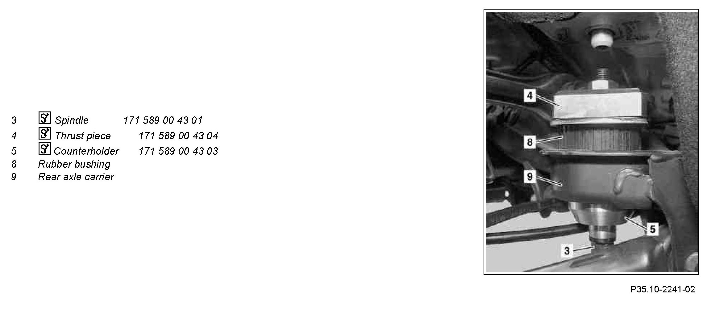 3 Using thrust piece (4), counterholder (5) and spindle (3), draw the rubber mount (8) into the rear axle carrier (9).