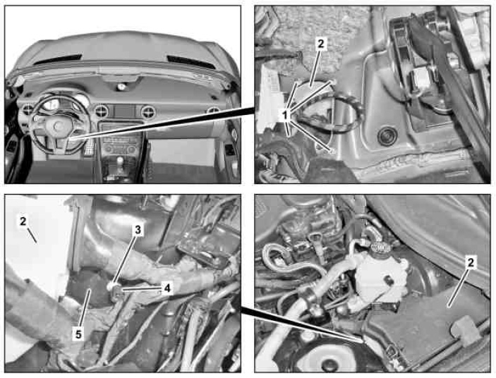 1 Unscrew nuts (1) from fuse box (2).