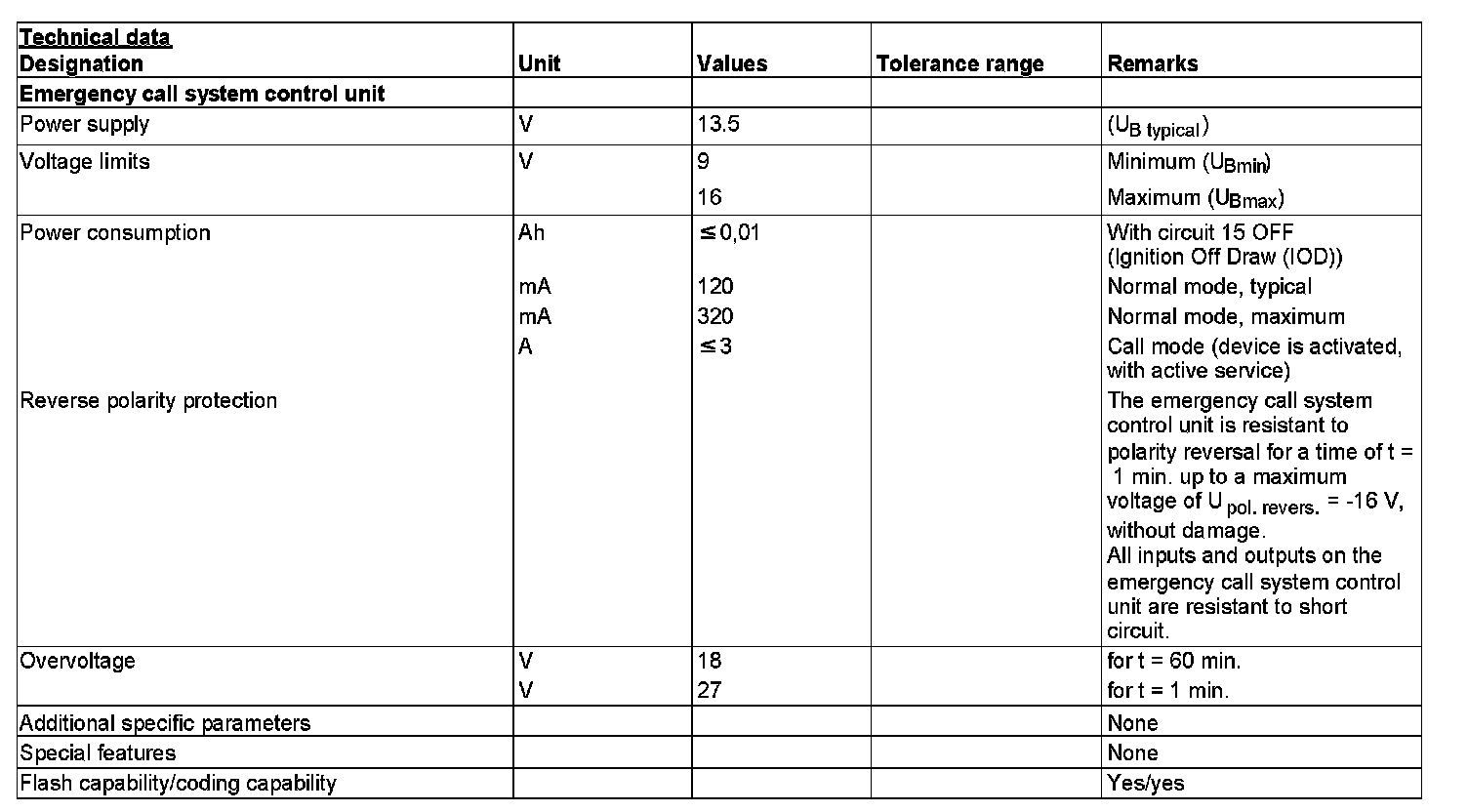 - Four day transmission and reception capability, as soon as an SMS is received, the emergency call system control unit is activated (wake-up); after four days the emergency call system reverts to the "sleep mode"