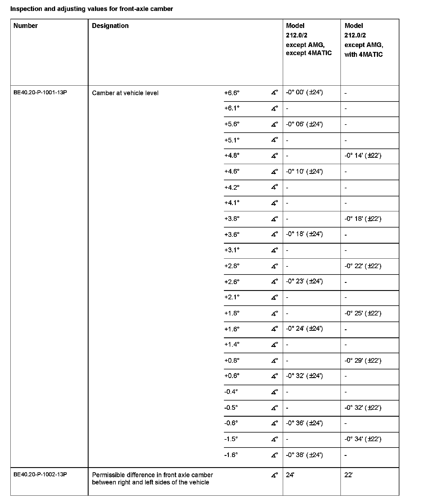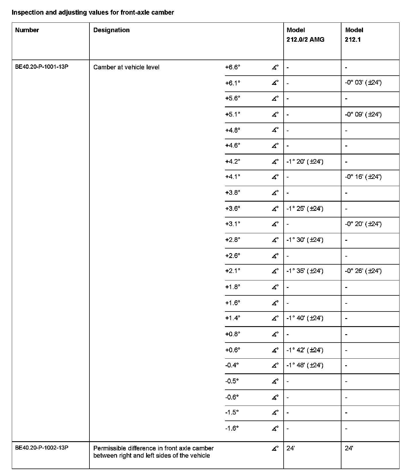 Inspection and adjusting values for front-axle camber: