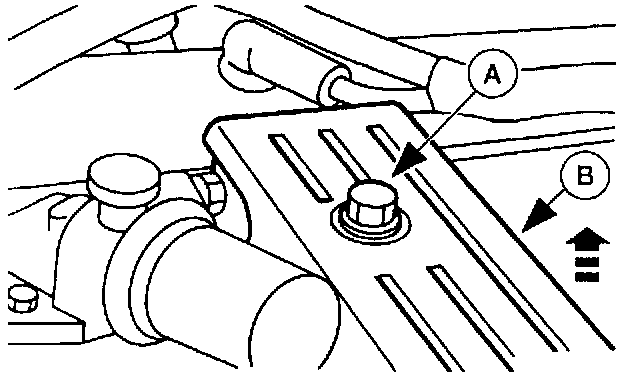2. Remove the (A) accelerator control splash shield bolt and remove the (B) splash shield.