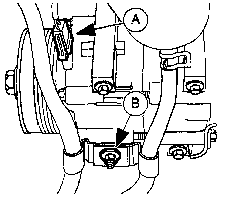 4. Disconnect the (A) A/C clutch electrical connector and remove the (B) power steering hose clamp nut.