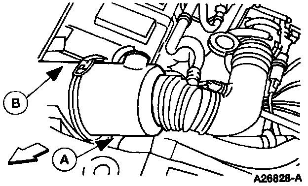 2. Release the (A) air cleaner clamp and disconnect the (B) Mass Air Flow (MAF) sensor extension wiring from the engine wiring harness.
