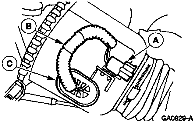 4. Remove the (A) MAF sensor extension harness connector from the engine air cleaner cover and peel back the (B) wire convolute and slide the (C) grommet down the extension wire.