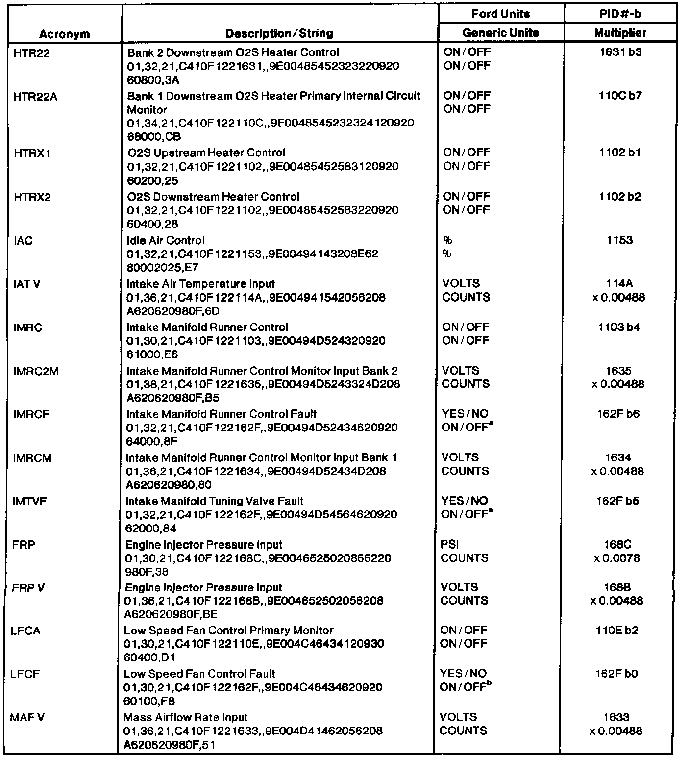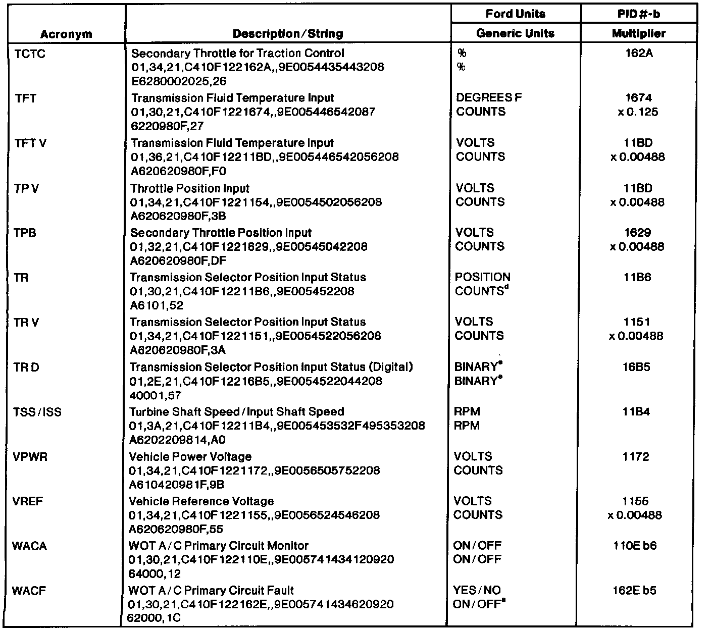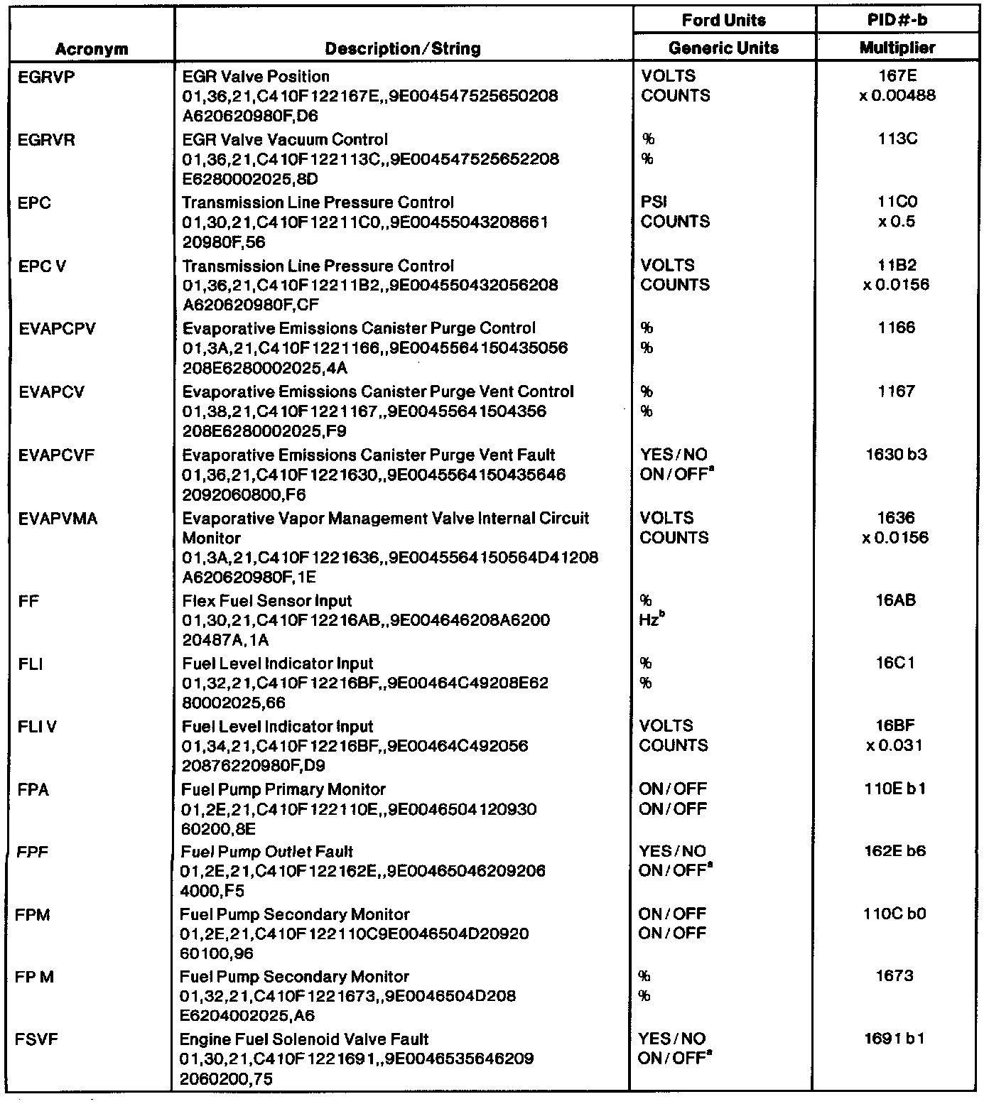 The Ford Parameter Identification (PID) list reflects only Ford manufacturer-specific PIDs used in the diagnostic procedures. The table lists the string of characters entered in a generic scan tool when accessing enhanced diagnostic PID information. When accessing these PIDs, the values will be continuously updated. For more information, refer to the Society of Automotive Engineers (SAE) J2205 document. Multiply the number of counts by the multiplier provided in the table for the proper conversion to Ford units.NOTE: Be sure the PID is supported by the vehicle strategy according to the pinpoint test step or the strings may display erroneous data.