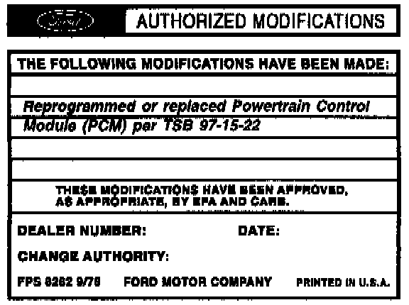 Obtain an Authorized Modification Decal (FPS 8262 - obtainable through DOES II, 25/pkg) and list the date, dealer number, and summary of modifications performed. Select a prominent place adjacent to the Vehicle Emission Control Information Decal suitable for installing the Authorized Modifications Decal. Clean the area, install the decal, and cover it with a clear plastic decal shield.