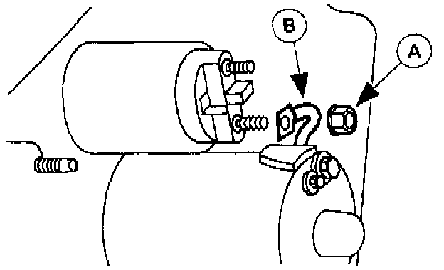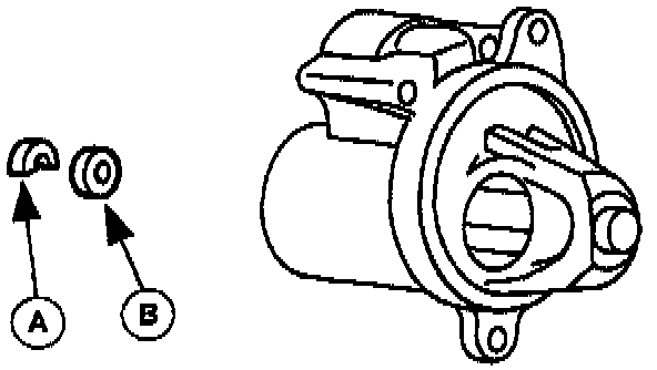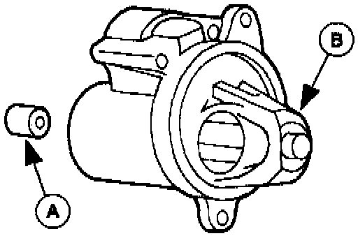 1. Remove the (A) starter solenoid M-terminal nut and the (B) starter motor brush holder cable.