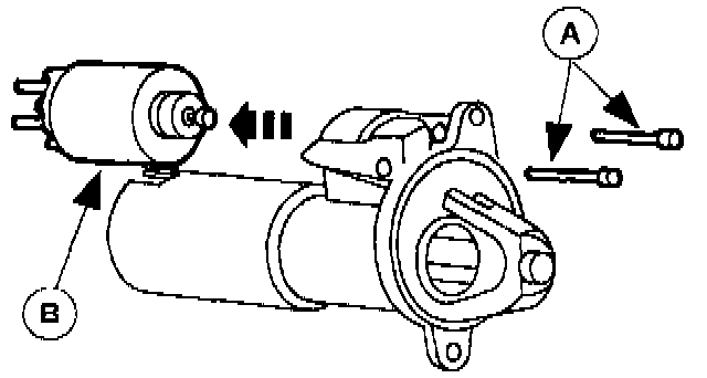 2. Remove the two (A) solenoid bolts and the (B) starter solenoid.