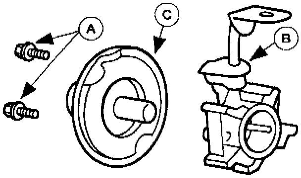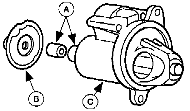 1. Soak the two (A) bushings for 20 minutes in 20W engine oil Syncolon SCC-4-030 or equivalent meeting Ford specification WSF-M1C218-B and install them in the (B) brush end plate and the (C) drive end housing.