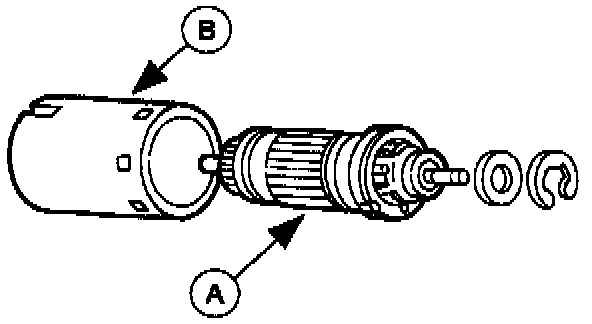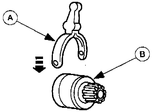 14. Remove the (A) starter drive stop ring and the (B) stop ring retainer.