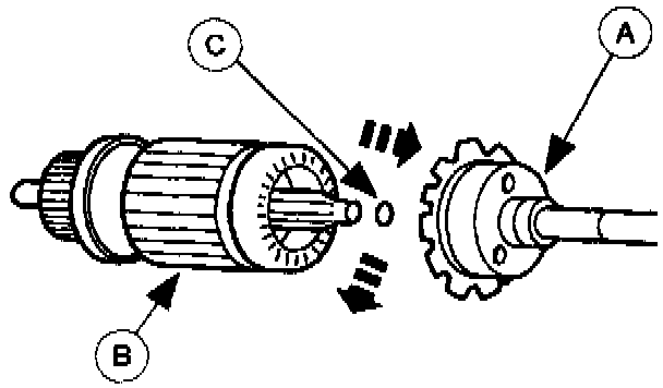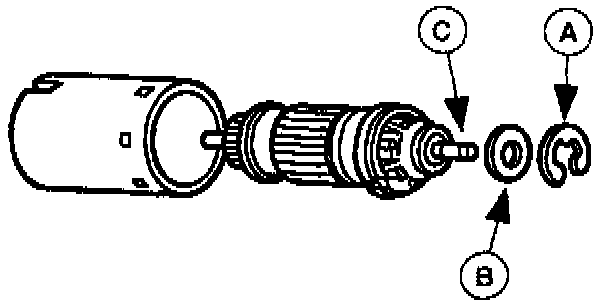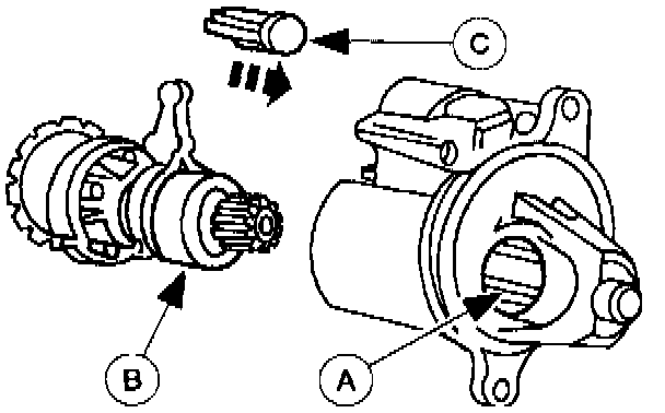 11. Separate the (A) output shaft from the (B) starter motor armature and remove the (C) armature thrust ball.
