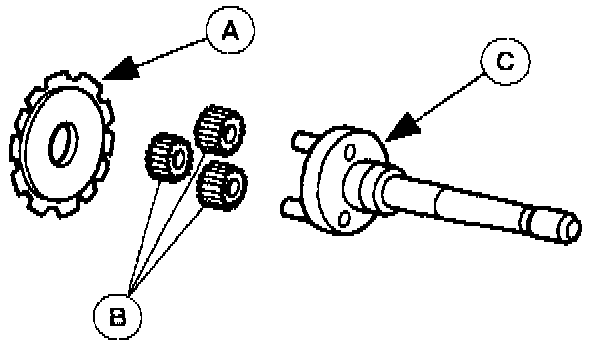 12. Remove the (A) planet gear retainer and the three (B) planet gears from the (C) output shaft.