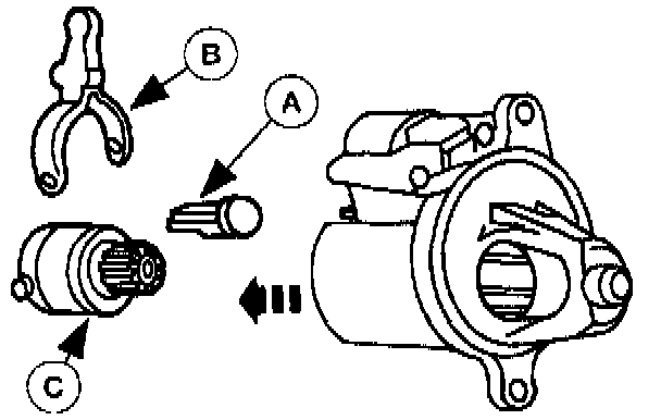 ^ Remove the (A) seal, the (B) drive lever and pin, and the (C) starter drive.
