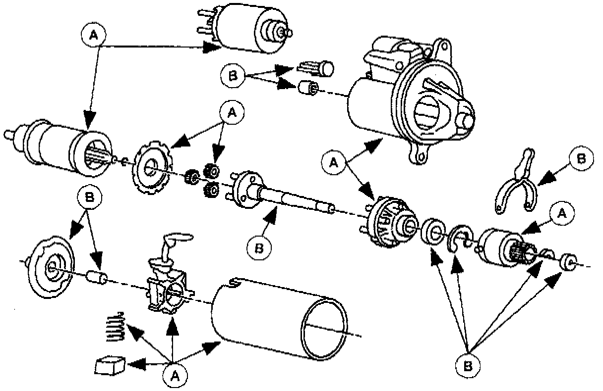 16. Clean the starter motor parts. Use a brush or dry cloth only to clean (A) damageable parts. Use solvent to clean (B) other parts.