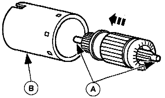 8. Remove the (A) starter motor armature from the (B) starter frame and magnet.
