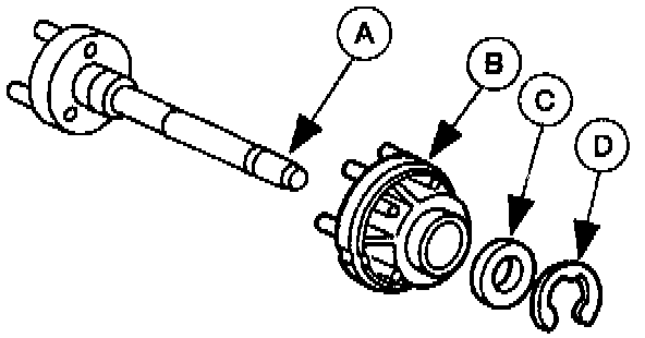 6. Lubricate the (A) output shaft spline with 20W Syncolon SCC-4-030 or equivalent meeting Ford specification WSF-M1C218-B and install the (B) stationary gear, the (C) pinion thrust washer, and the (D) E-ring.