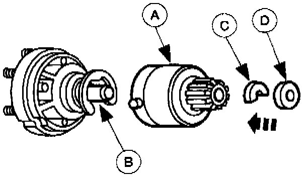 7. Install the (A) starter drive on the (B) output shaft. Install the (C) starter drive stop ring and the (D) stop ring retainer onto the end of the starter drive output shaft.