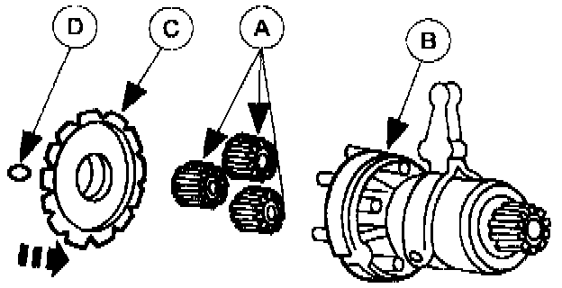 9. Lubricate and install the (A) planet gears on the (B) output shaft and install the (C) planet gear retainer and the (D) armature thrust ball.