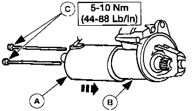 11. Position the (A) starter frame assembly on the (B) drive end housing and install the two (C) through bolts.