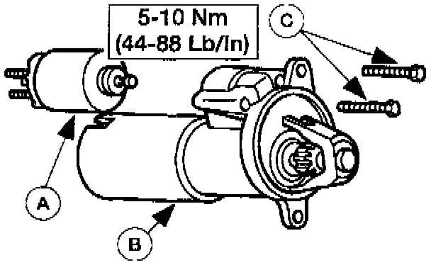 12. Position the (A) starter solenoid on the (B) starter motor and install the two (C) solenoid bolts.