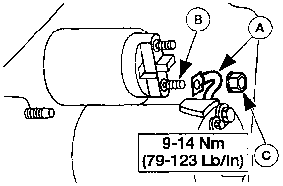 13. Position the (A) starter motor brush holder cable on the (B) starter solenoid M-terminal and install the (C) starter solenoid M-terminal nut.