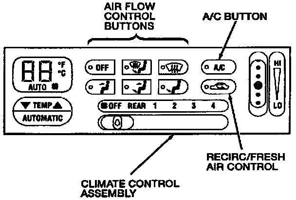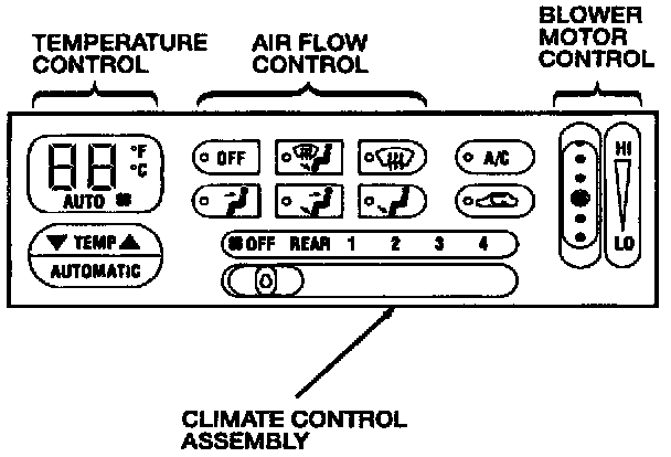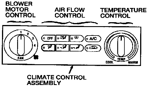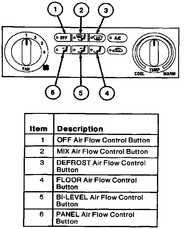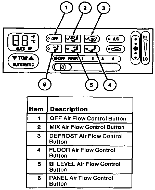 The air flow control's six mutually canceling air flow control buttons operate the panel/floor/defrost door actuator motor which controls the position of mode doors. The position of the mode doors controls the air flow through the system. There is an air flow control button for each of the following functions: