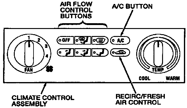 The air flow control is one large switch containing eight airflow control buttons. The air flow control section is divided into two sub-sections. The first section contains six mutually canceling air flow control buttons. The second section contains the recirc/fresh air flow control and a dummy button, or the A/C button (if equipped).