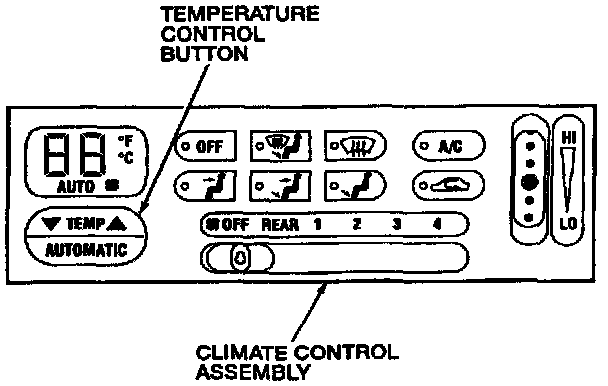 Temperature control of the electronic heating and defrosting system is determined by the TEMP button. Depressing the button will show and set selected temperature in the display window. Push the left side of the button to lower the temperature setting. Push the right side of the button to raise the temperature.