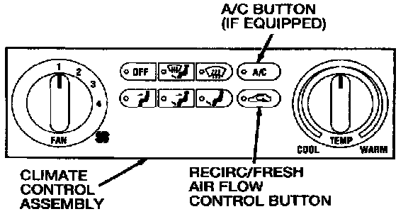 The RECIRC/FRESH air flow control button operates independently from the rest of the air flow control. Depressing the RECIRC/FRESH air flow control button activates a door actuator motor which positions the A/C air inlet door. This controls the air which is drawn into the system from within and/or from outside of the vehicle.