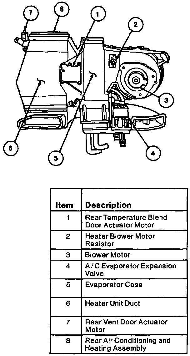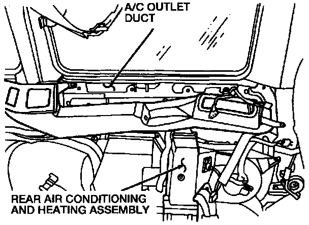 The rear air conditioning and heating system assembly is removed as a complete unit. Further disassembly can be done on the bench. The door actuator motors, the blower motor, and heater blower motor resistor can be removed with the rear air conditioning and heater assembly in the vehicle.