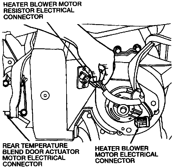6. Disconnect the heater blower motor electrical connector and heater blower motor resistor electrical connectors.