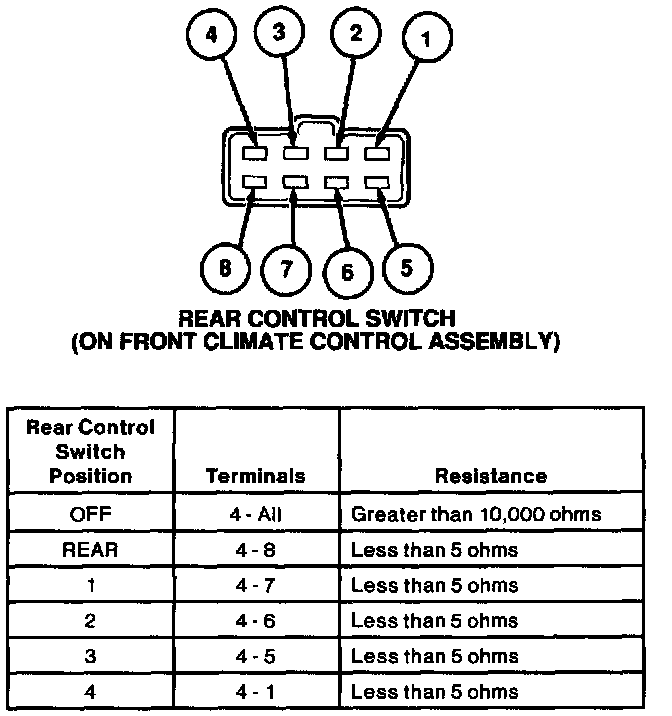 4. If the resistances are not as specified, then replace the rear control switch at the front climate control assembly. Otherwise, return to the pinpoint tests.