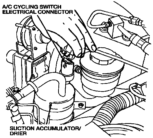 NOTE: The A/C cycling switch is located on top of the suction accumulator/drier. It is mounted on a Schrader valve, so the A/C cycling switch can be removed without discharging the A/C system.