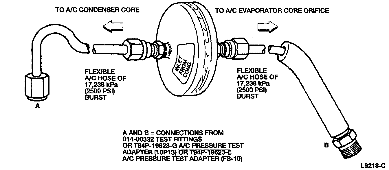 10. Install a pancake filter in the condenser to evaporator tube between the A/C condenser core and the A/C evaporator core orifice. Be sure the filter inlet is toward the A/C condenser core. Connections can be made using Test Adapter Set D93L-19703-B or equivalent and flexible refrigerant hose of 17,000 kPa (2500 psi) burst rating. Individual fittings are also available.