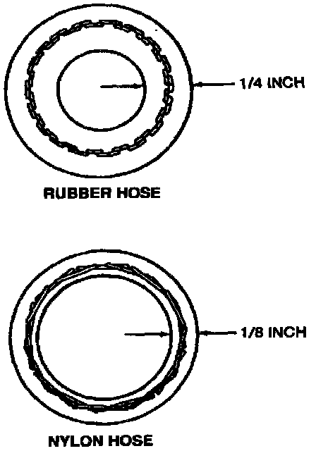 6. Determine the type of evaporator to compressor suction line with which you are working. To do this, cut the hose into two pieces (make the cut closer to the A/C compressor than the suction accumulator/drier) and measure the hose wall thickness. Rubber lined hose has a wall thickness of 6 mm (1/4 inch) and nylon lined hose has a wall thickness of 3 mm (1/8 inch).