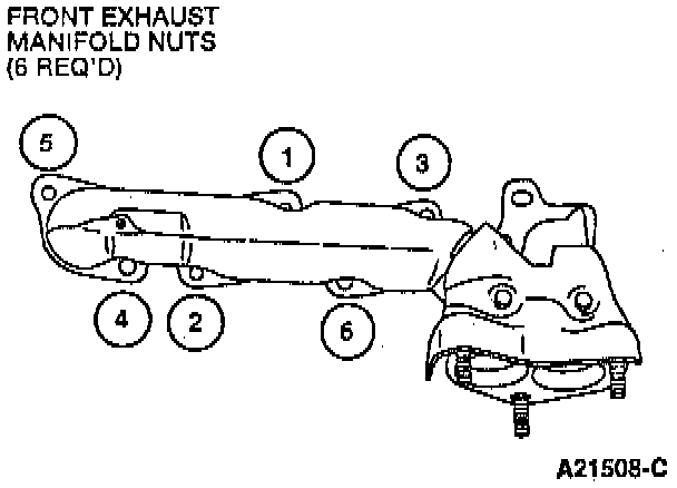 ^ Tighten the front exhaust manifold nuts in the sequence shown to 18-22 Nm (13-16 ft. lbs.).