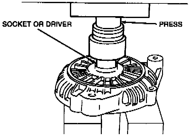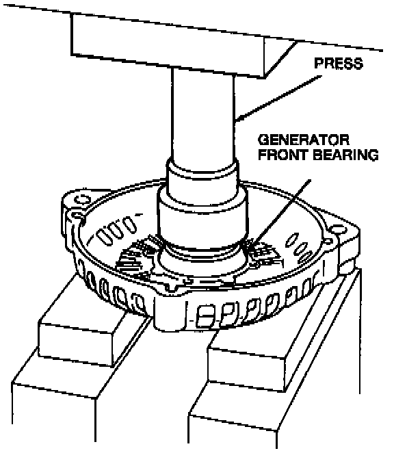 8. Using a socket or driver that fits the generator front bearing outer race and a press, remove the generator front bearing from the generator front housing.
