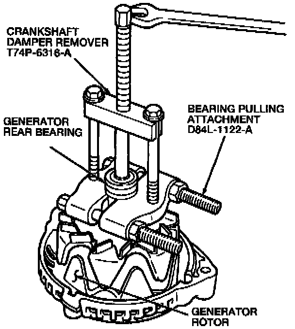 3. Use Bearing Pulling Attachment D84L-1122-A, or equivalent, and Crankshaft Damper Remover T74P-6316-A to remove the generator rear bearing from the generator rotor shaft. Remove the stopper ring from the generator rear bearing.