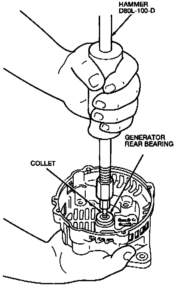 12. If the generator rear bearing is still in the generator rear housing, use an appropriate Collect (part of D80L-100-A) or equivalent and Hammer D80L-100-D to remove the generator rear bearing from the generator rear housing.